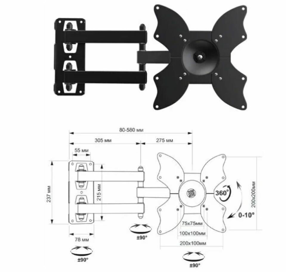 Кронштейн для телевизора на стену наклонно-поворотный с диагональю 13"-42" Electriclight КБ-01-88, черный