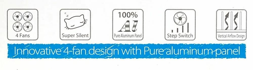 Целых 4 вентилятора Металлическая панель Почти не шумит Переключатель режимов работы (выкл - дальняя пара кулеров - ближняя пара - все четыре кулера) |