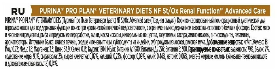 Купить Влажный корм для кошек Purina Veterinary Diets NF St/Ox Renal Function Advanced Care, паштет, упаковка 12 шт х 195 гр