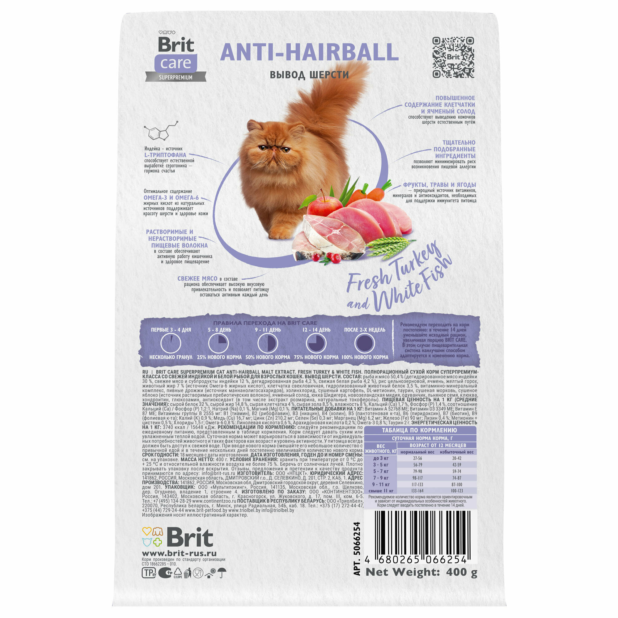 BRIT CARE, Сухой корм с белой рыбой и индейкой для взрослых кошек "Cat Anti-Hairball ", 1.5 кг