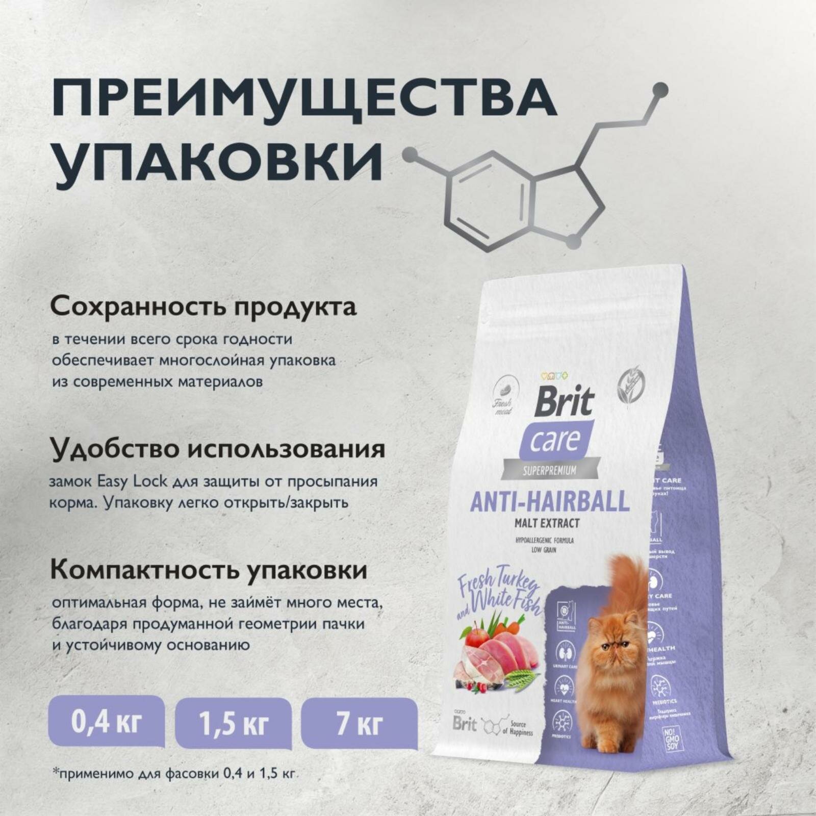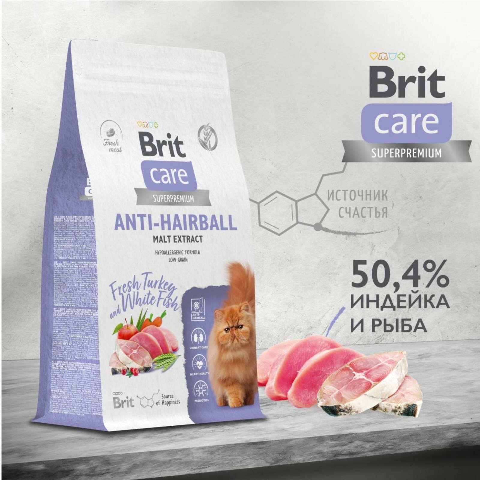 BRIT CARE, Сухой корм с белой рыбой и индейкой для взрослых кошек "Cat Anti-Hairball ", 1.5 кг