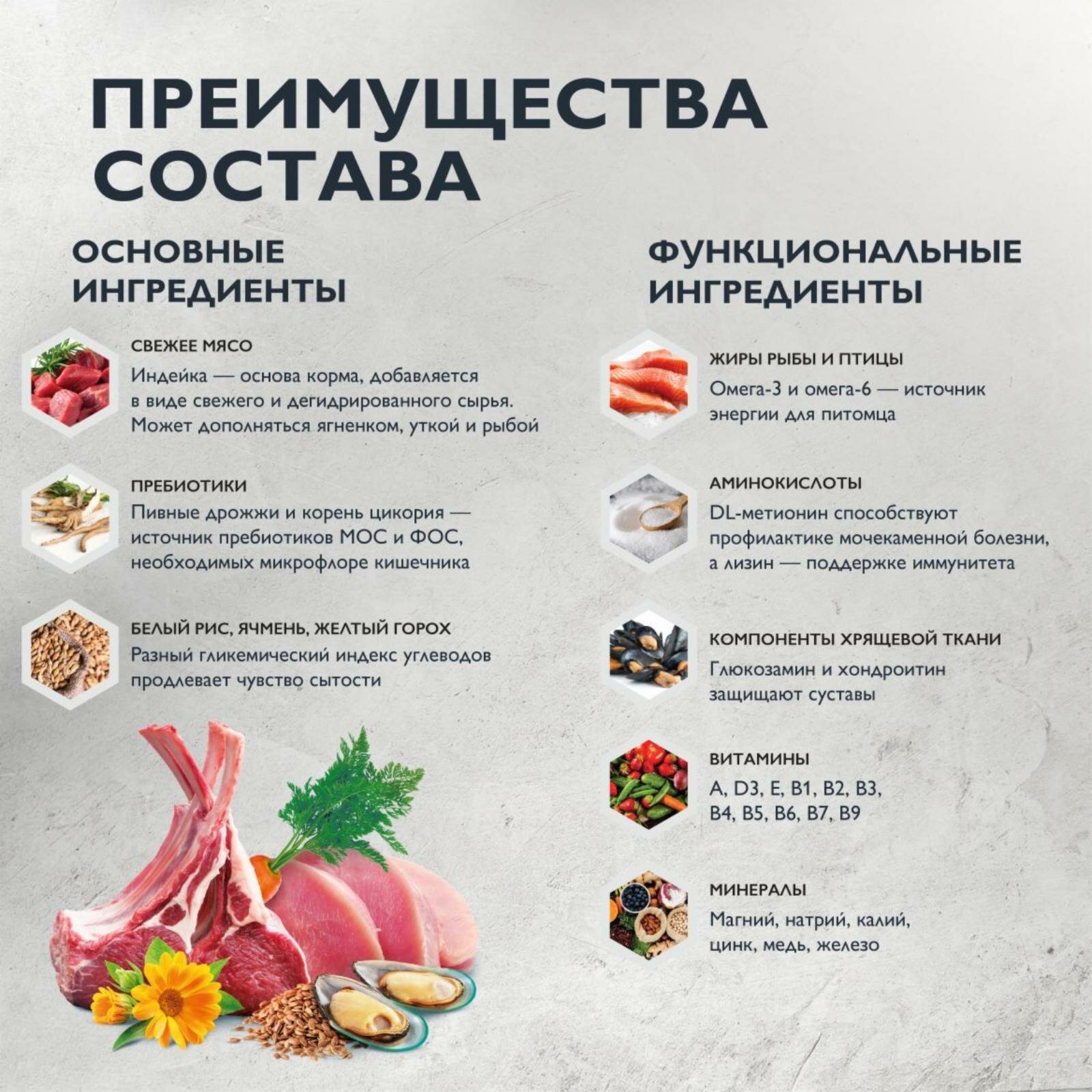 | Состав | дегидрированное мясо курицы 37 %, маис цельнозерновой, маисовый протеин, рис, жир куриный (источник Омега-6 жирных кислот), свекольная пульпа, гидролизованная и дегидратированная печень 2,5 %, яблоки, дрожжи (источник маннанолигосахаридов), витаминно-минеральный комплекс, рыбий жир (источник Омега-3 жирных кислот), таурин, топинамбур (источник фруктоолигосахаридов), клюква, антиокислитель, экстракт юкки Шидигера |