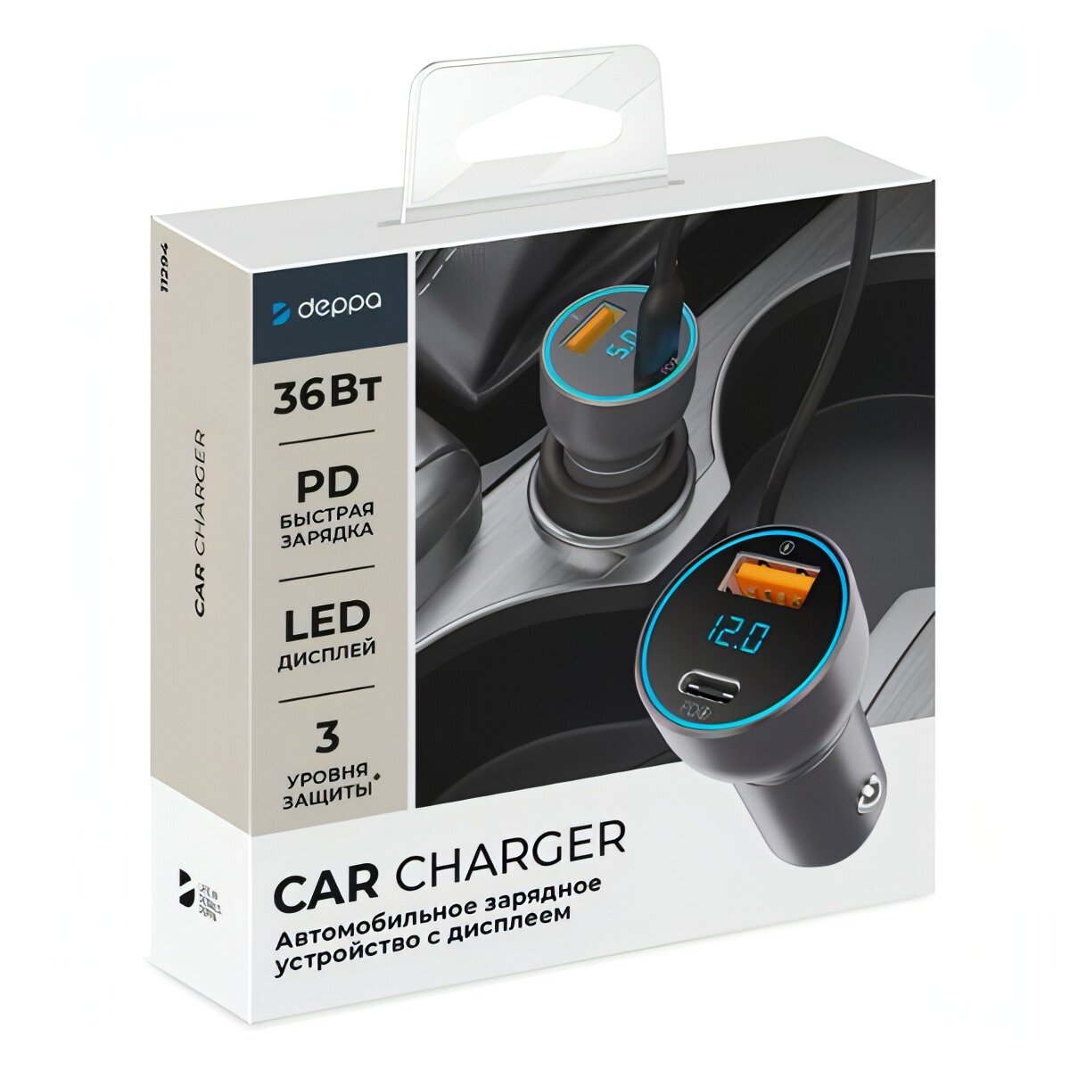 Автомобильное зарядное устройство USB-A + USB-C, PD, QC3.0, 36W, дисплей, алюминий, графит, DEPPA