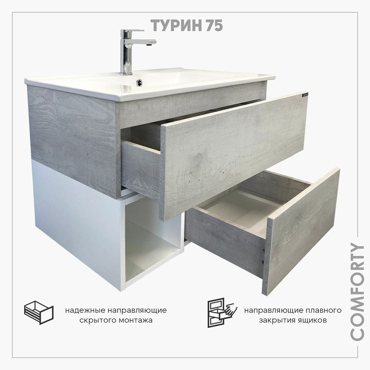 COMFORTY. Тумба-умывальник "Эдинбург-75" бетон светлый с черной столешницей, с раковиной COMFORTY T-Y9378