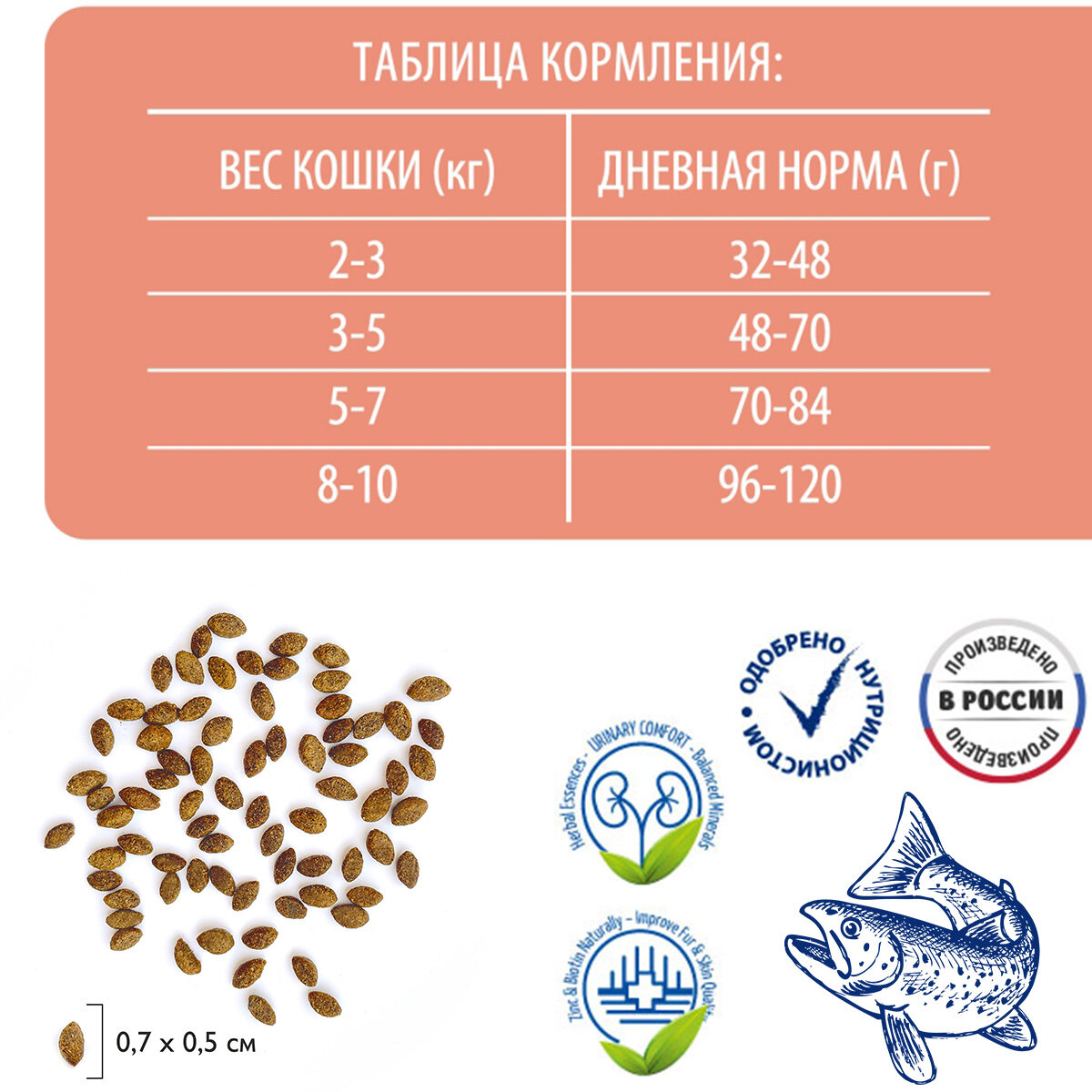 | Состав | дегидрированное мясо 37% (лосось, курица), кукуруза, глютен кукурузный, рис, жир куриный, свекольная пульпа, гидролизованная и дегидратированная печень 3%, дрожжи (источник маннанолигосахаридов), витаминно-минеральный комплекс, таурин, топинамбур (источник инулина – фруктоолигосахаридов), клюква, DL-Метионин, антиокислитель, экстракт юкки Шидигера |
