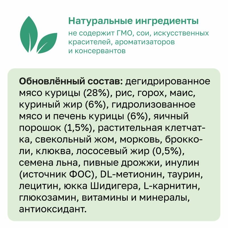| Состав | дегидрированное куриное мясо (10%), экстракт животного белка 14%, рис, горох, ячмень, куриный жир, клетчатка, кукуруза, гидролизованная куриная печень, лососевый жир, семена льна, дегидрированный лосось, яичный порошок, пивные дрожжи, инулин (источник ФОС), клюква |