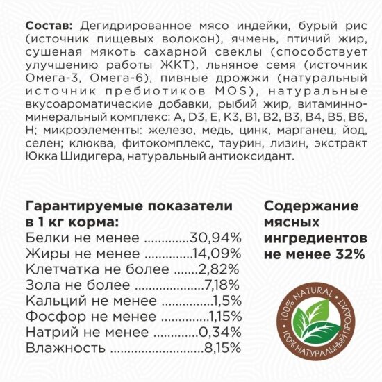 | Состав | дегидрированное мясо индейки, бурый рис (источник пищевых волокон), ячмень, птичий жир, сушеная мякоть сахарной свеклы (способствует улучшению работы ЖКТ), льняное семя (источник Омега-3, Омега-6), пивные дрожжи (натуральный источник пребиотиков MOS), натуральные вкусоароматические добавки, рыбий жир, клюква, фитокомплекс, таурин, лизин, экстракт Юкка Шидигера, натуральный антиоксидант. |