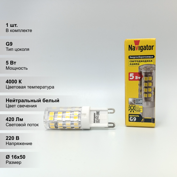Светодиодная лампа Navigator 71 267, 5 Вт, цоколь G9, дневного света 4000К, 1 шт.