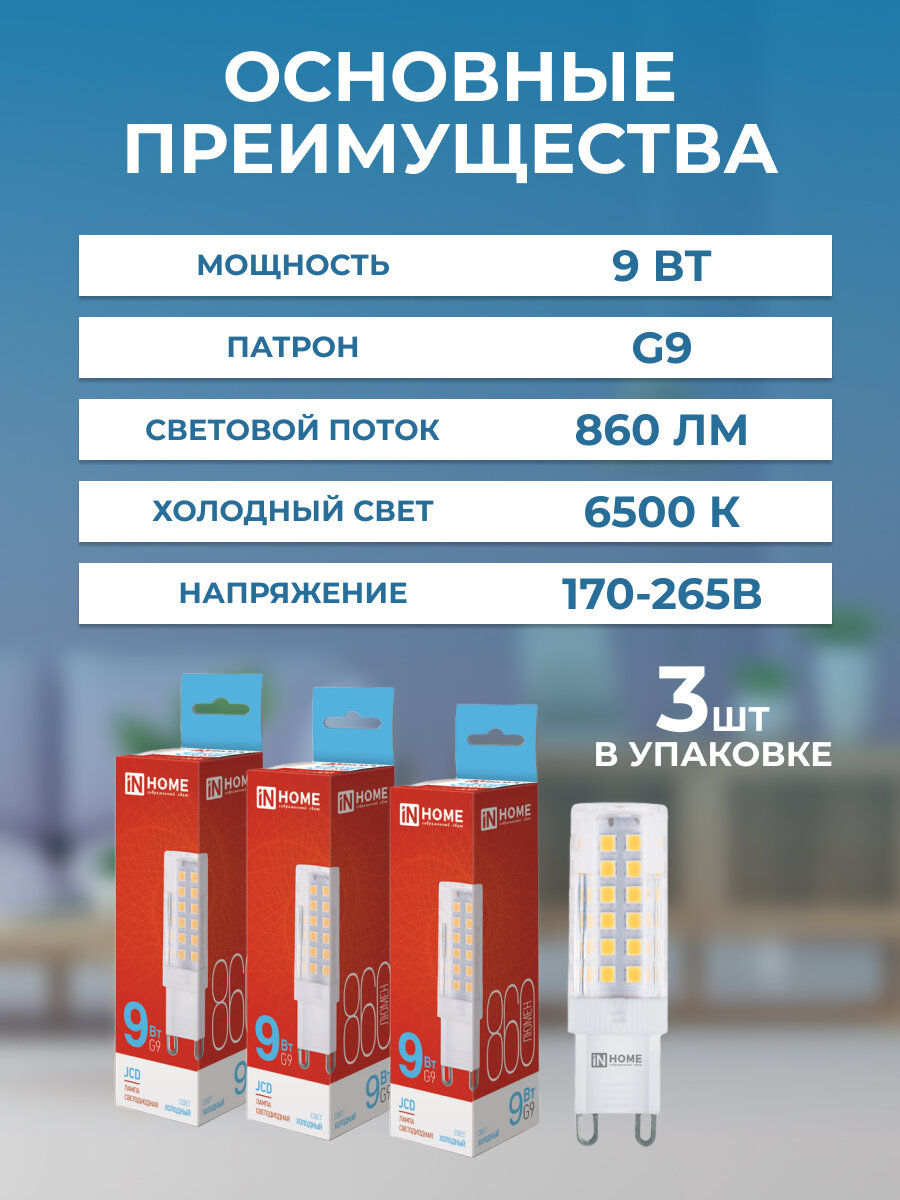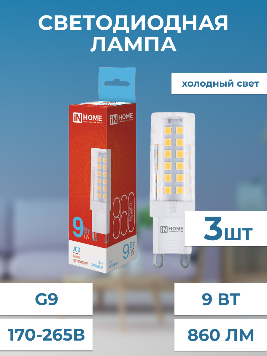 Лампа светодиодная IN HOME LED-JCD 9Вт 230В G9 4000К, 860Лм, дневной белый свет, 3 шт