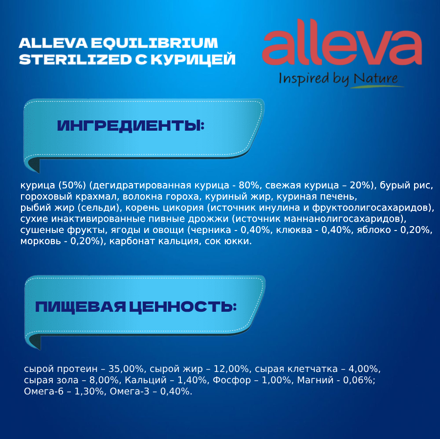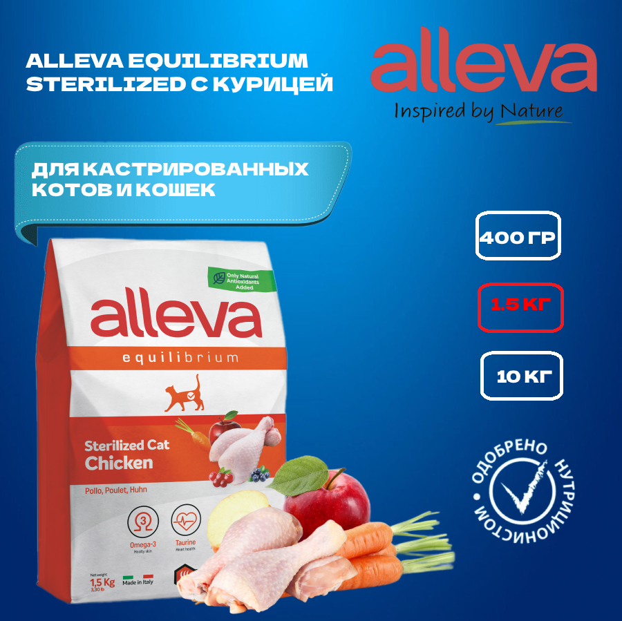 Сухой корм для кошек ALLEVA EQUILIBRIUM CHICKEN STERILIZED CAT Аллева корм Эквилибриум для кастрированных котов и стерилизованных кошек с курицей 1,5кг