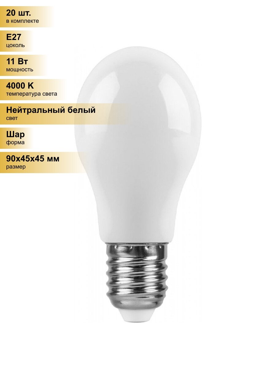 Купить (20 шт.) Светодиодная лампочка Feron шар G45 E27 11W(935lm) 4000K 4K матовая 90x45, LB-750 25950 Нейтральный белый. Цоколь E27