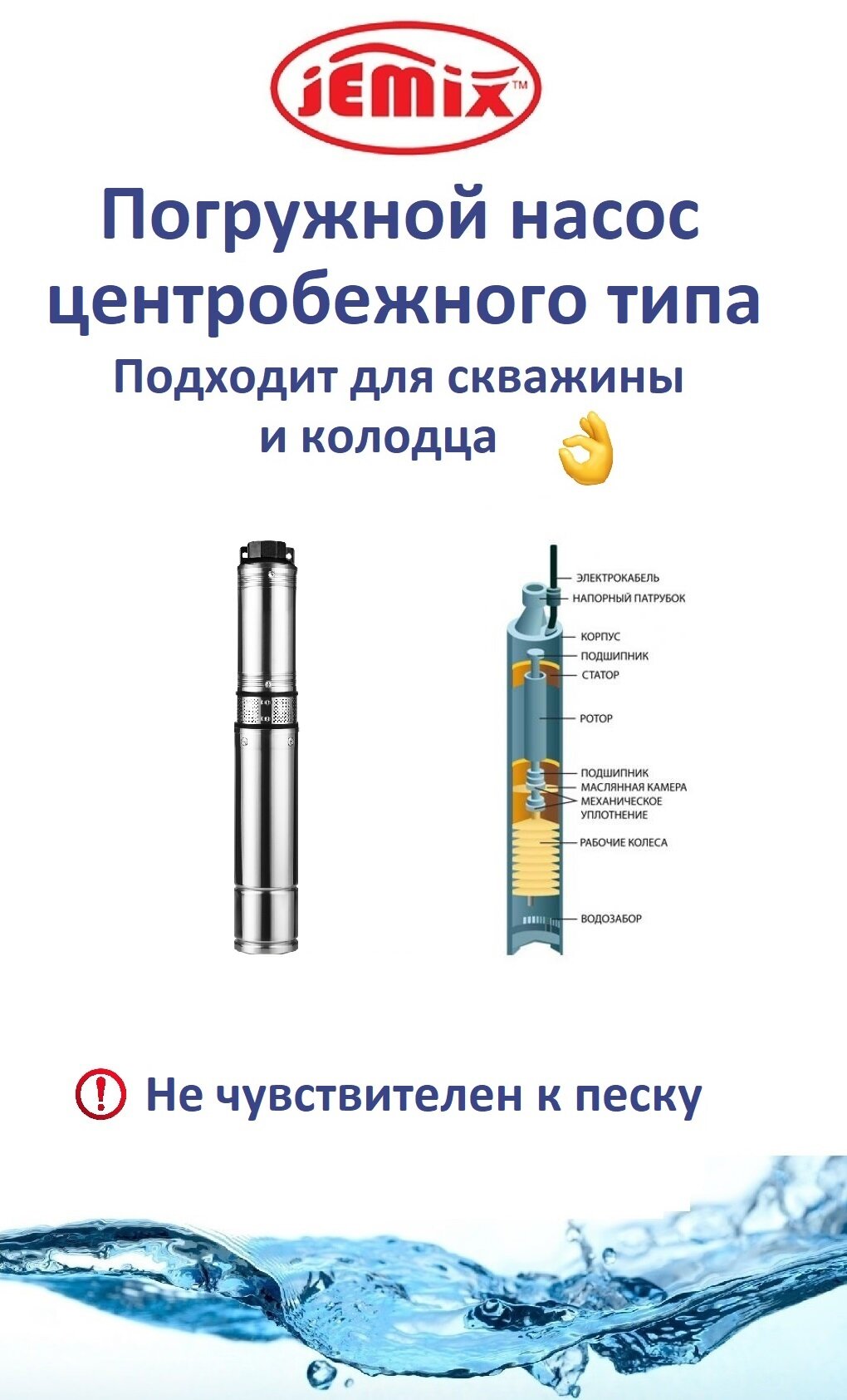 Насос скважинный JEMIX СН 3-2-80, центробежный, 1100 Вт, напор 121 м, 33 л/мин, кабель 2 м