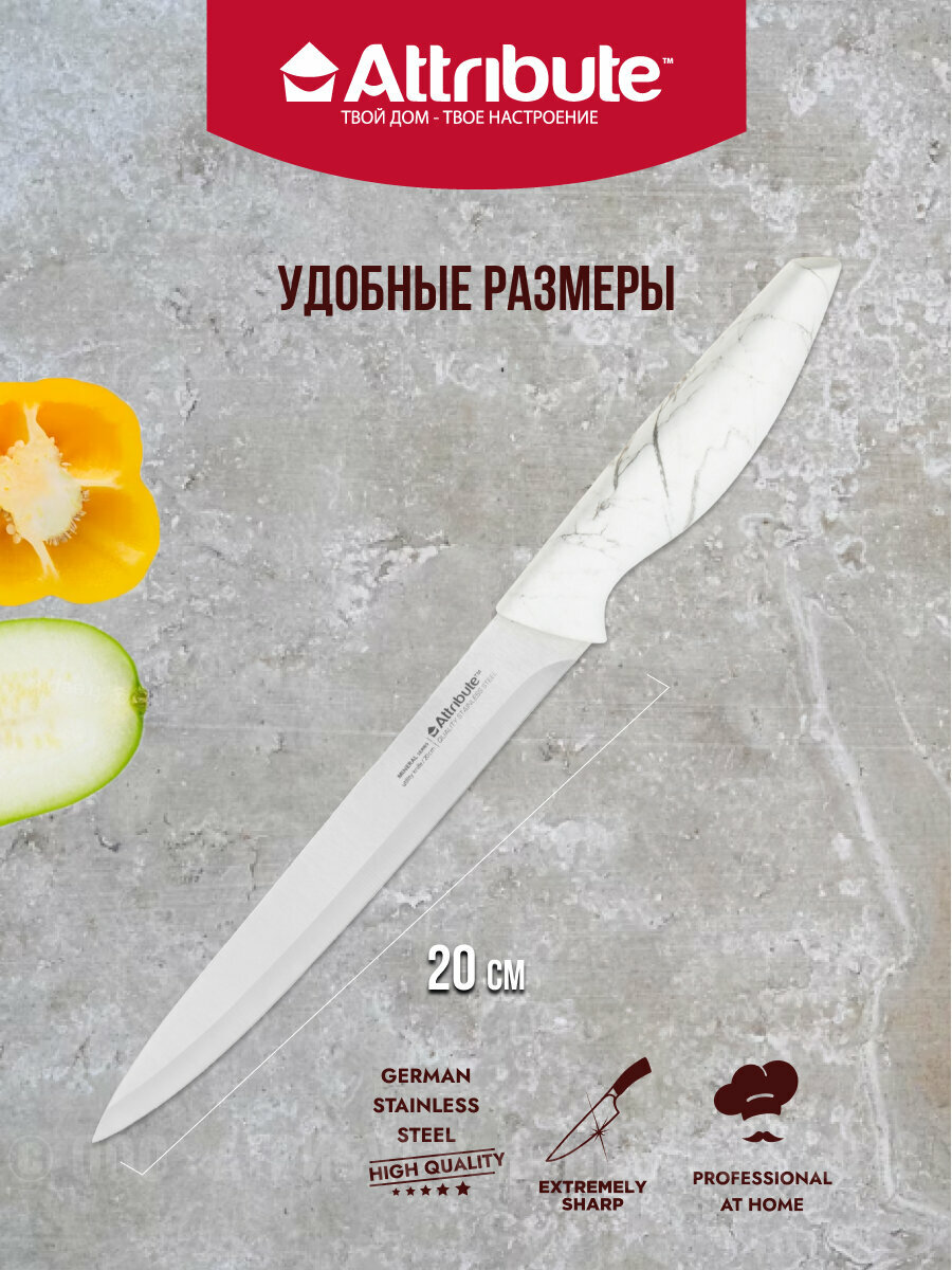 | Дополнительная информация | Нож ATTRIBUTE Marble 20см универсальный нерж. сталь, пластик |