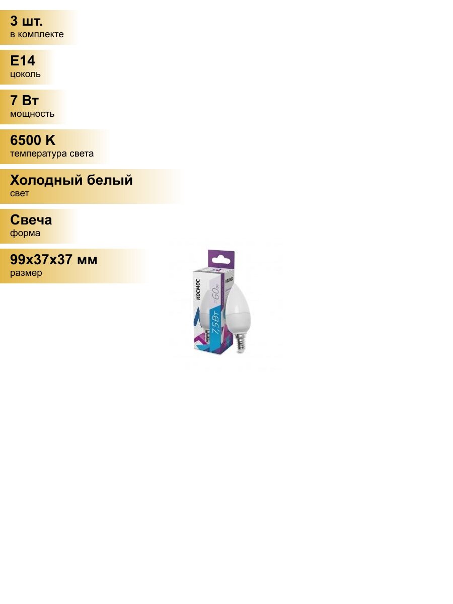 Купить (3 шт.) Светодиодная лампочка Космос свеча E14 7,5W (7W) (600lm) 6500K 6K матов. 99x37 LkecLED7.5wCNE1465 Холодный белый. Цоколь E14