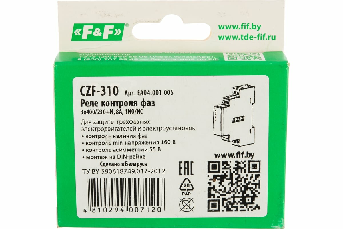 Реле контроля фаз CZF-310 (1 модуль; монтаж на DIN-рейке; 3х400/230+N 8А 1NO/NC IP20) F&F EA04.001.005