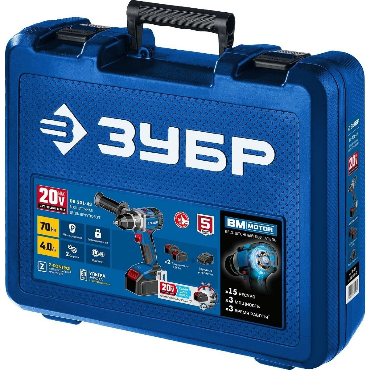 Дрель-шуруповерт ЗУБР DB-201-42 20 В, бесщеточная, 2 АКБ (4Ач), в кейсе, Профессионал