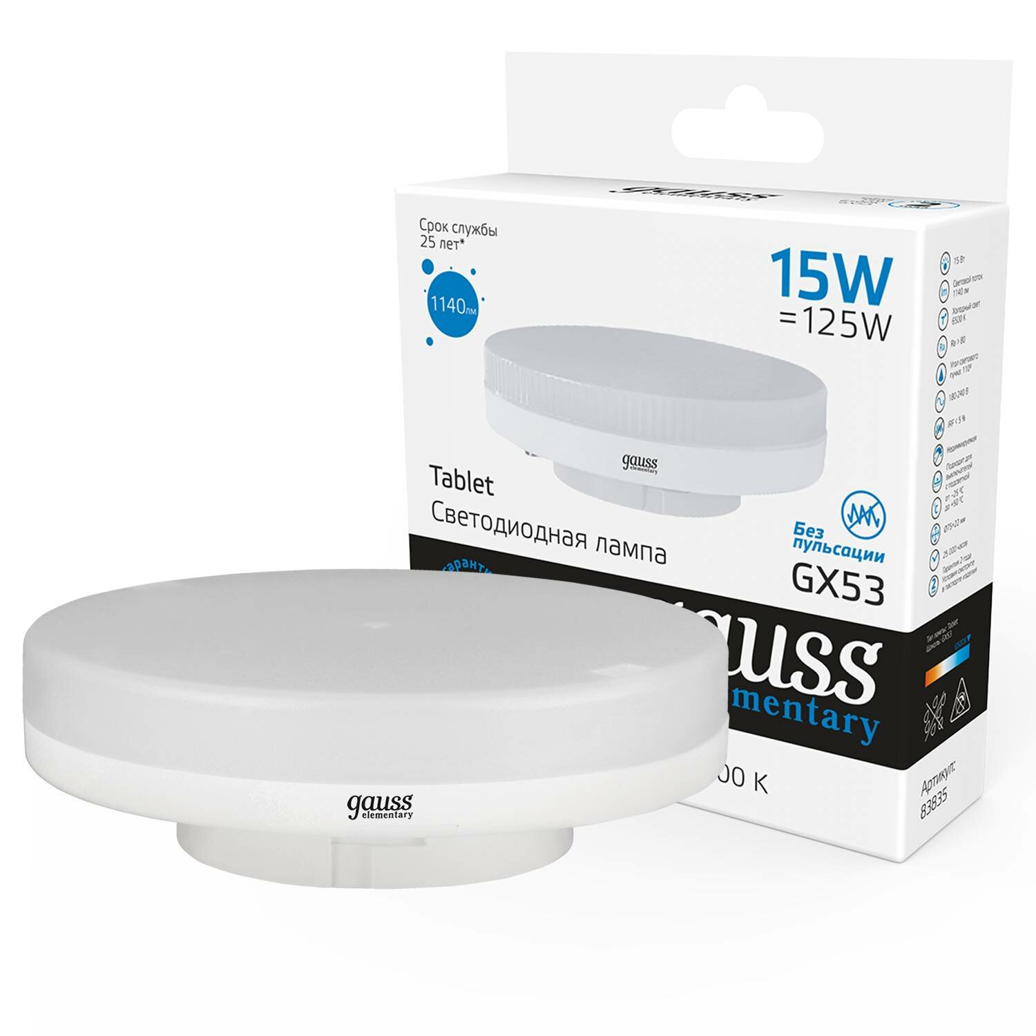 (15 шт.) Светодиодная лампочка Gauss Elementary GX53 15W(1080lm) 4100K 4K матовая, пластик/алюм. 83825 Нейтральный белый. Цоколь GX53