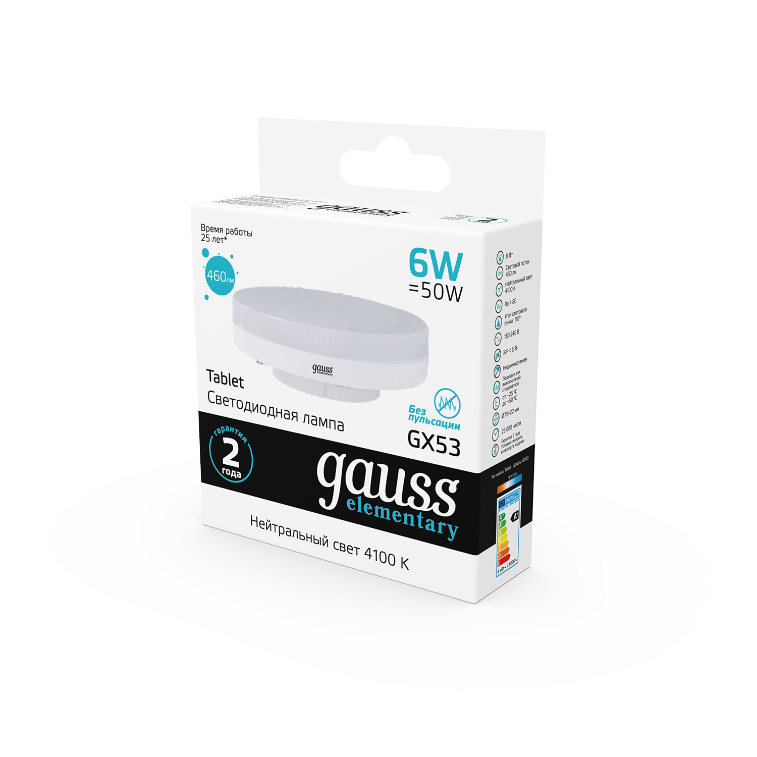 Лампочка светодиодная Gauss Elementary 6В эквивалент 40В 4100K 460Лм GX53 таблетка 83826