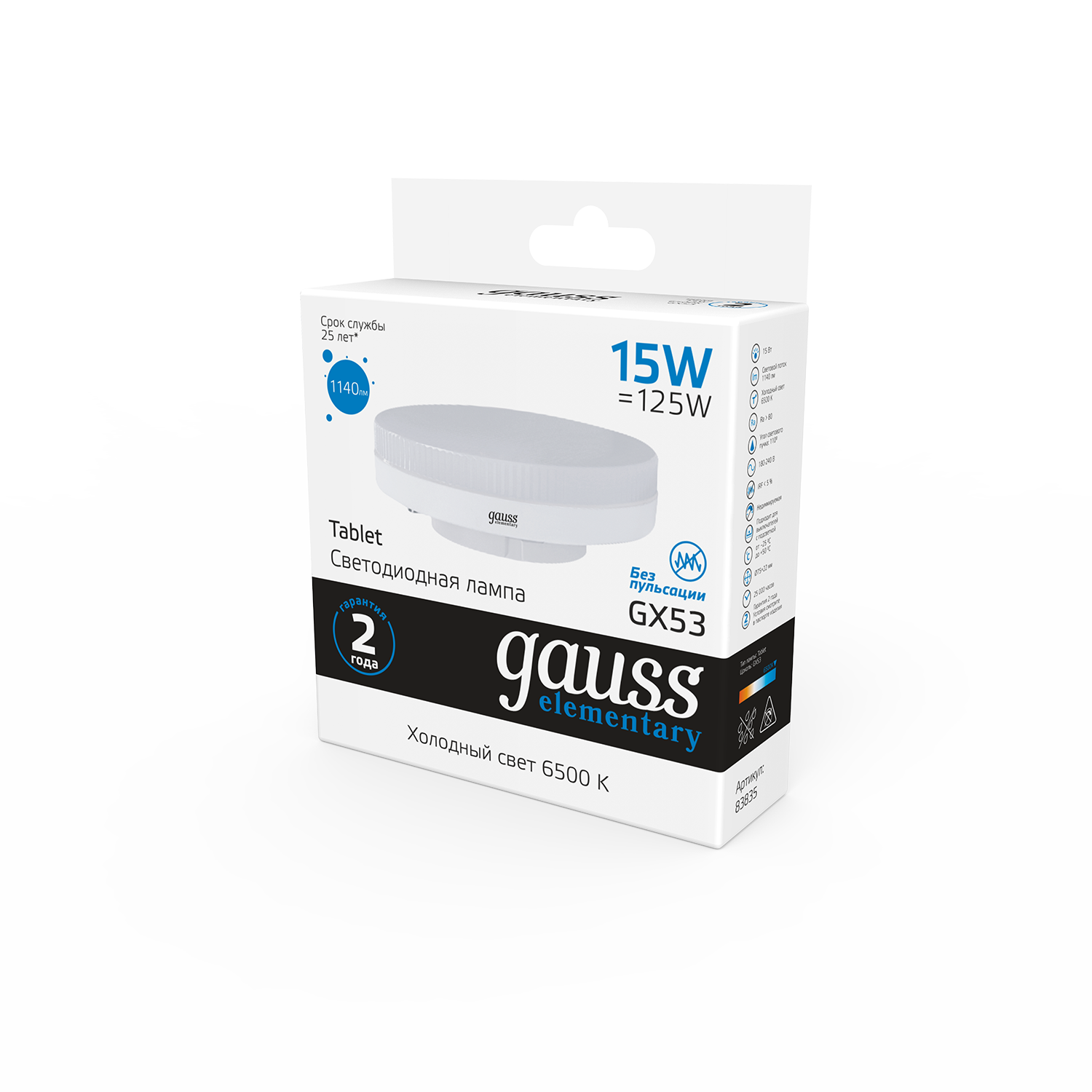 Лампочка светодиодная Gauss Elementary 15В эквивалент 125В 6500K 1140Лм GX53 таблетка 83835 (комплект из 2 шт.)