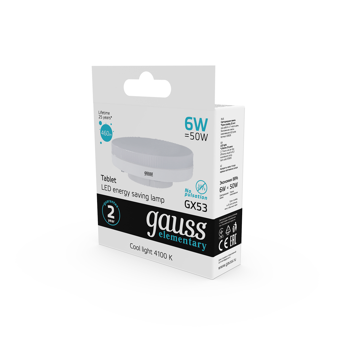 Купить Лампочка светодиодная Gauss Elementary 6В эквивалент 40В 4100K 460Лм GX53 таблетка 83826 (комплект из 5 шт.)