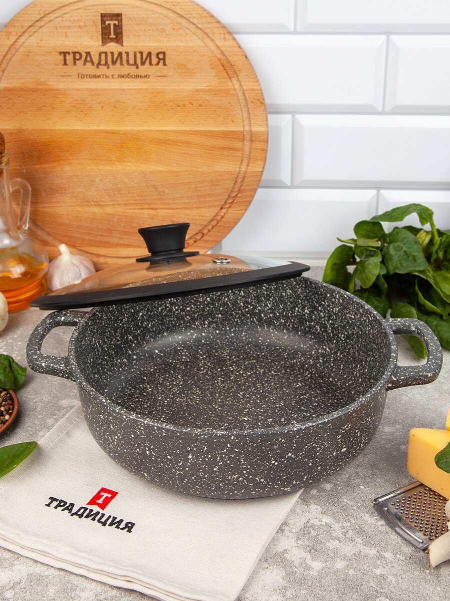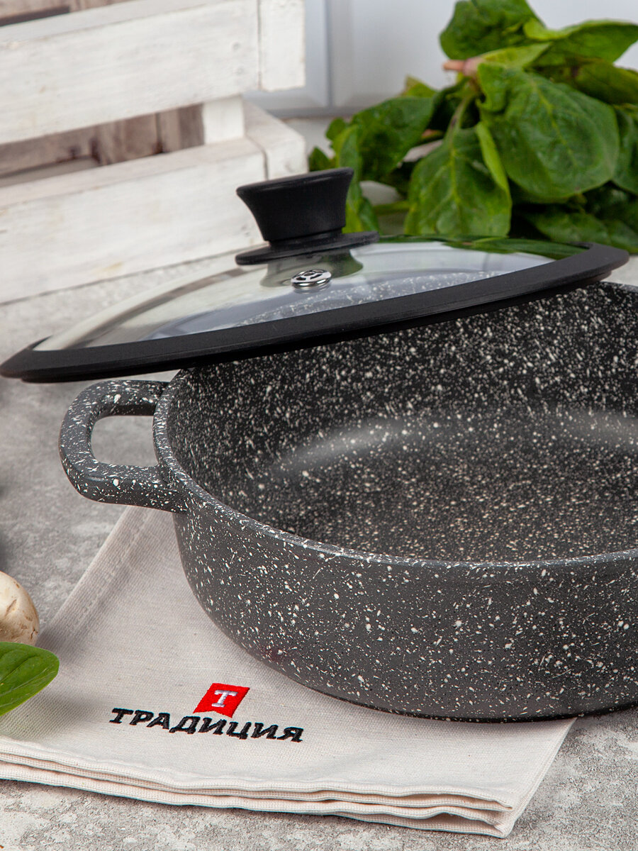 Жаровня литая с антипригарным покрытием Традиция Гранит 24 см с крышкой с силиконовым ободком