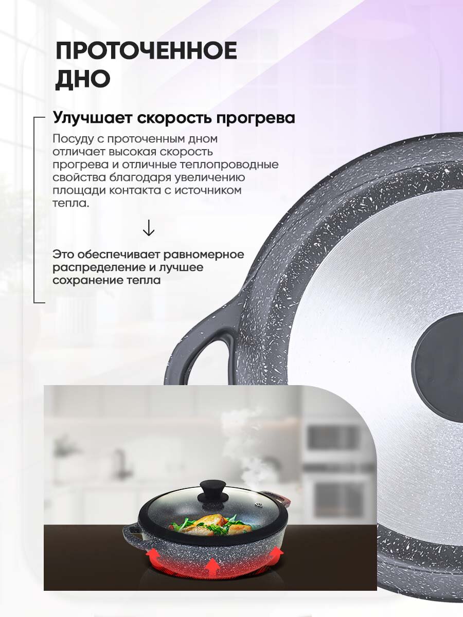 Жаровня литая с антипригарным покрытием Традиция Гранит 26 см с крышкой с силиконовым ободком