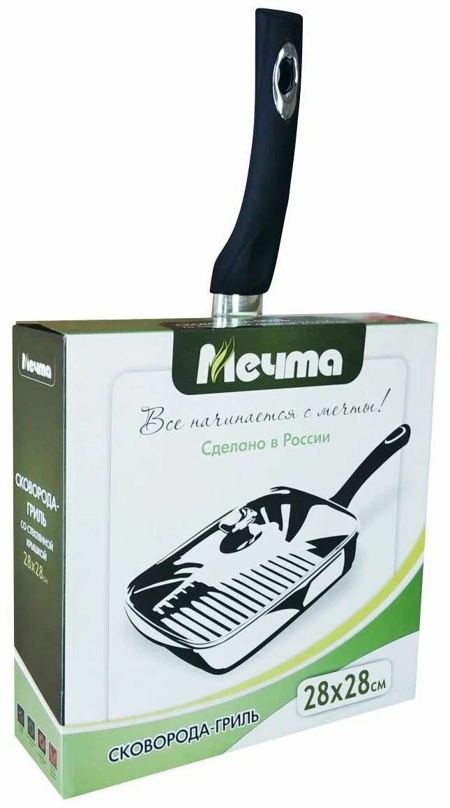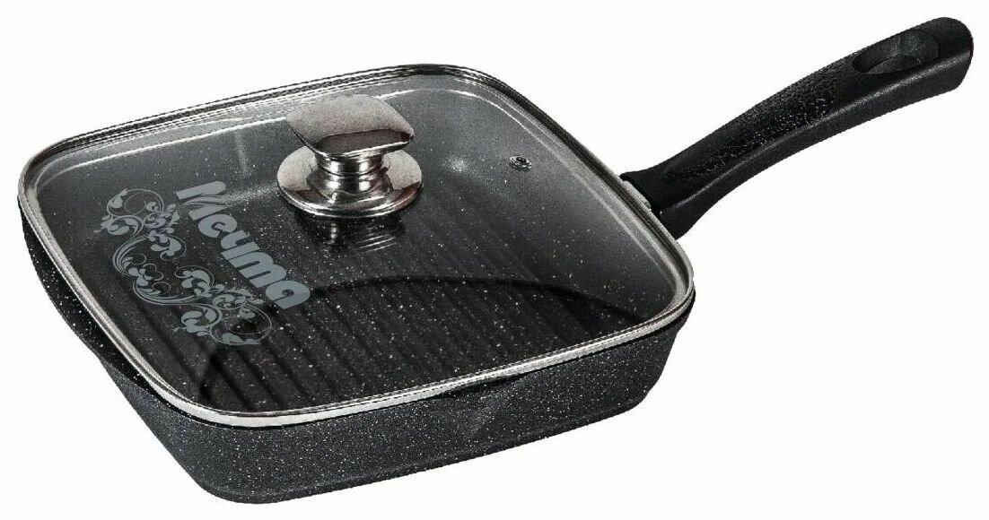 Сковорода гриль Мечта квадратная 28х28 см Гранит с антипригарным покрытием с несъемной ручкой и крышкой, НЕ индукционная