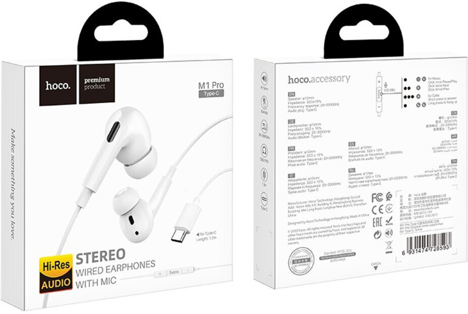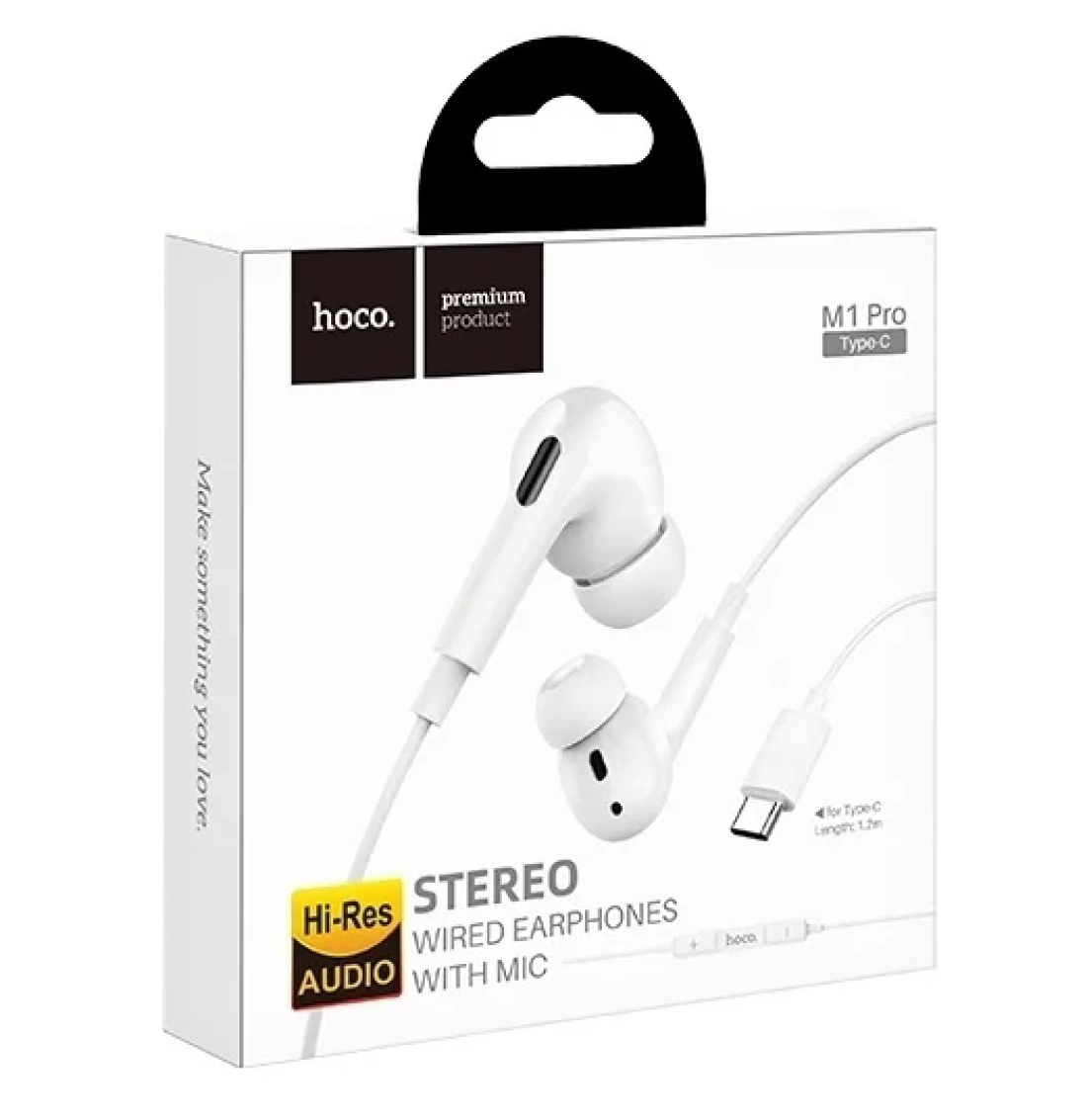Наушники Hoco M1 Pro, проводные, вакуумные, микрофон, Type-C, 1.2 м, белые