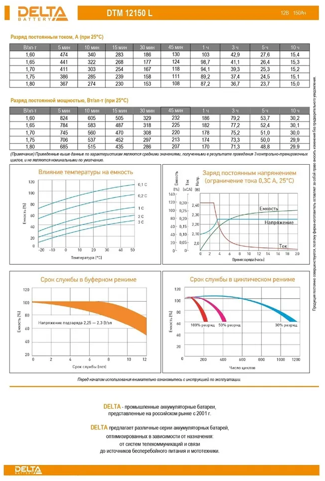 | Плюсы: | Качество исполнения корпуса и клемм. Полное соответствие реального веса тому что указан производителем в datasheet, неплохие результаты по реальной ёмкости измеренной по 10 часовому разряду (C10) в нашем тестировании (https://batteryexpert.ru/delta-dtm-12150-l/) |