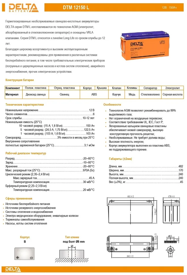 СохранитьАккумуляторная батарея Delta DTM 12150 L 12В/150Ач, клемма Болт М8 (482х170х240мм (240мм); 45кг; Срок службы 10-12лет; Г интересное: