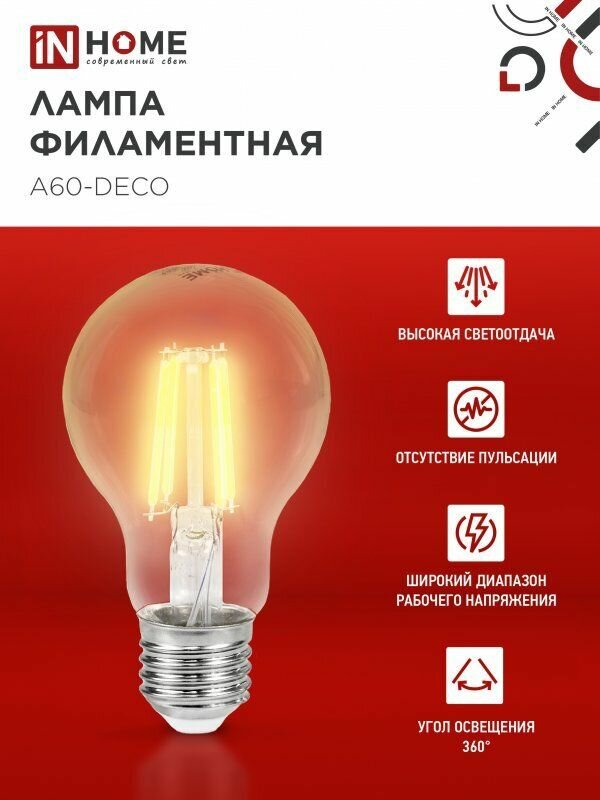 Лампа светодиодная IN HOME LED-A60-deco, 13 Вт, 230 В, Е27, 3000 К, 1370 Лм, прозрачная