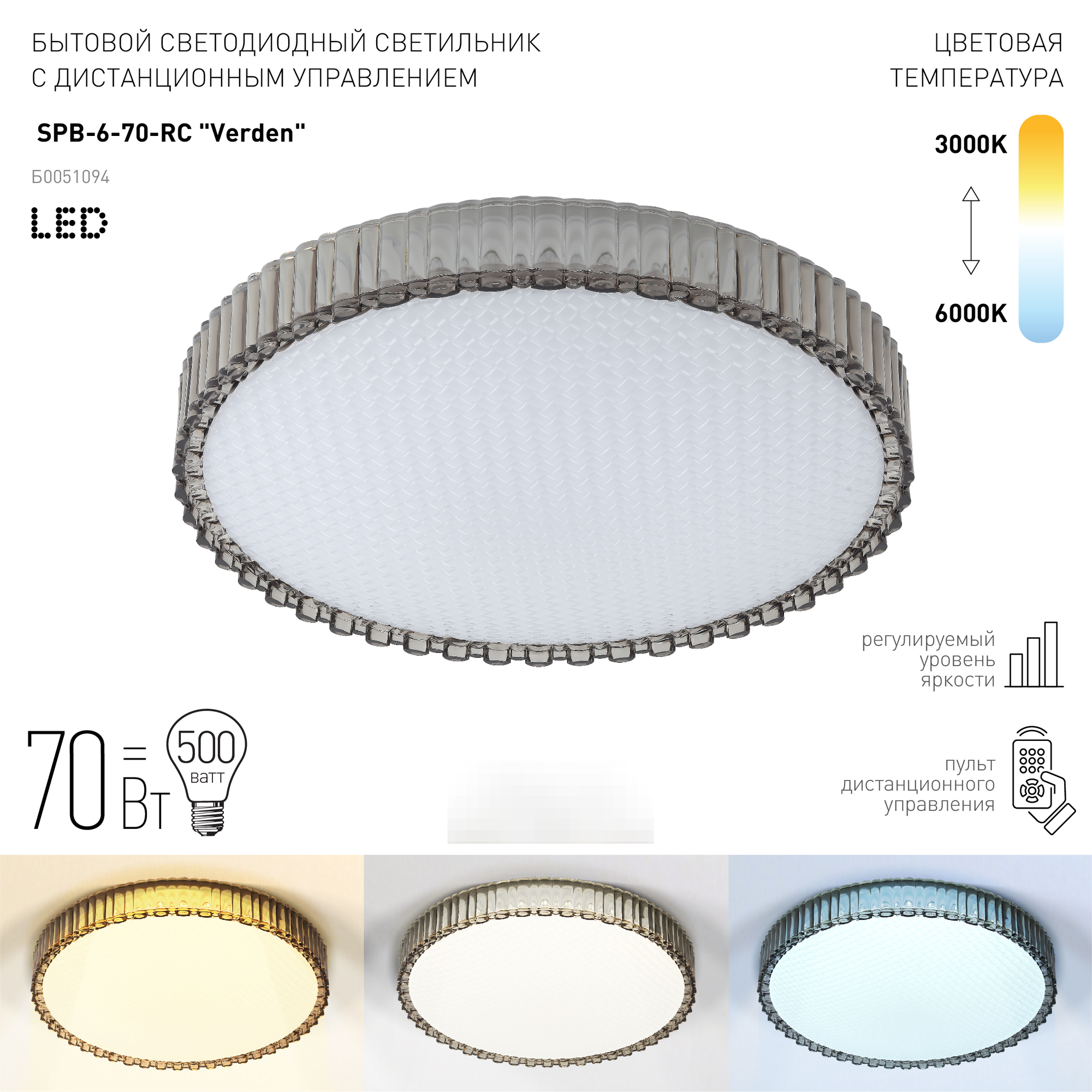 ЭРА Светильник потолочный светодиодный ЭРА Классик с ДУ SPB-6-70-RC Verden 70Вт 3400-5500К