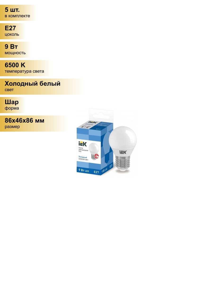 (5 шт.) Светодиодная лампочка IEK шар G45 E27 9W(810lm) 6500К 6K ECO LLE-G45-9-230-65-E27 . Цоколь E27