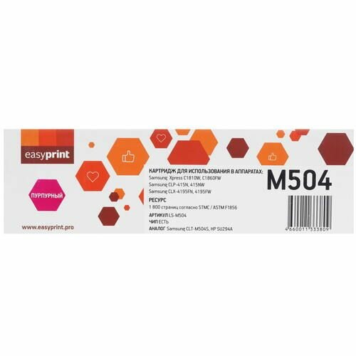 Картридж лазерный Easyprint LS-M504 для принтеров Samsung, пурпурный (magenta), совместимый. интересное: