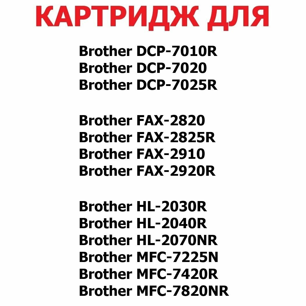 | Модель совместимого принтера | Brother DCP-7010 / Brother DCP-7010R / Brother DCP-7025 / Brother DCP-7025R / Brother DCP-7420 / Brother DCP-7820N / Brother FAX-2820 / Brother FAX-2825 / Brother FAX-2825R / Brother FAX-2920 / Brother FAX-2920R / Brother HL-2030 / Brother HL-2030R / Brother HL-2040 / Brother HL-2040R / Brother HL-2070N / Brother HL-2070NR / Brother MFC-7225 / Brother MFC-7420 / Brother MFC-7420R / Brother MFC-7820N / Brother MFC-7820NR / Brother MFC-7820R |