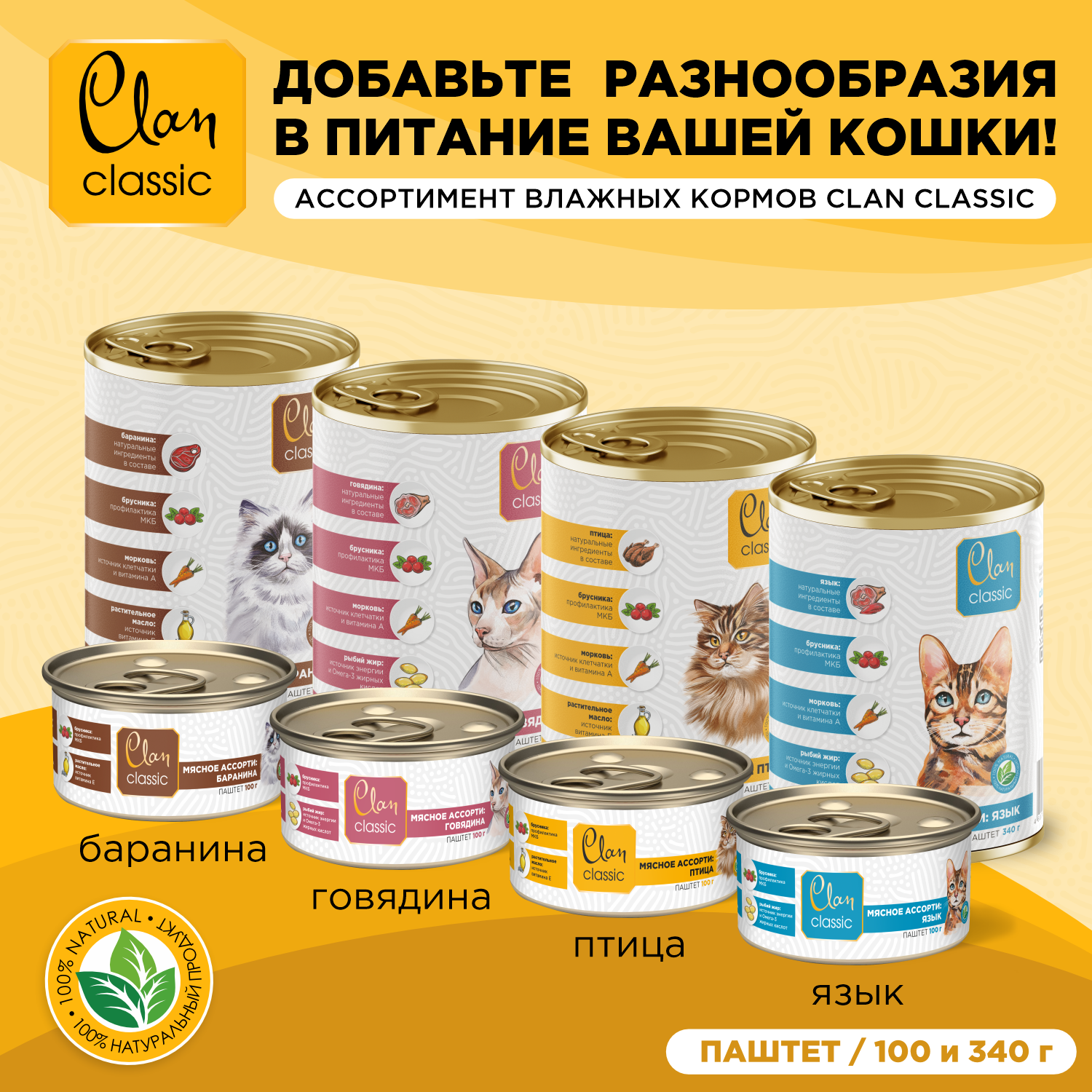 Clan Classic Senior-сухой корм для пожилых кошек с курицей и телятиной 400 г (паштет)