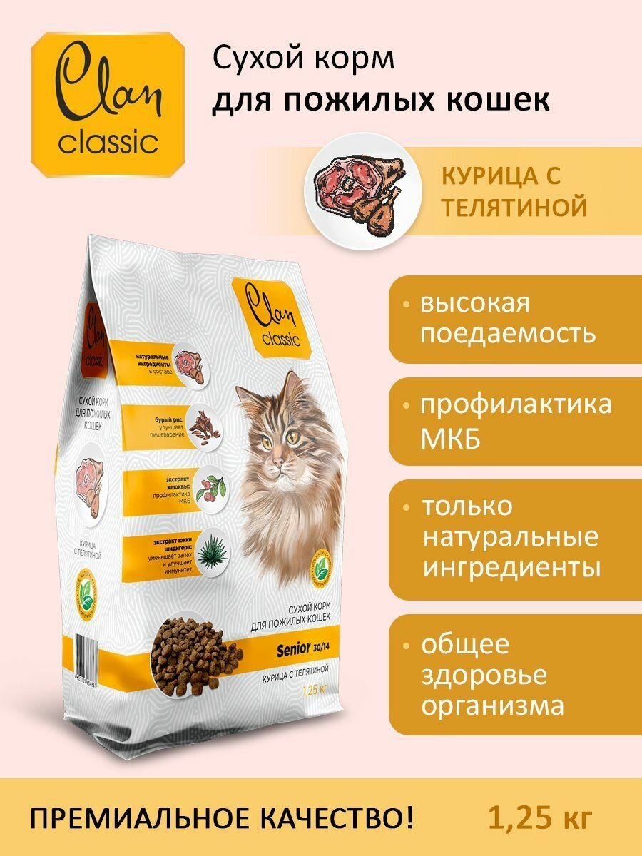 Корм для кошек сухой CLAN Classic Senior 30/14 для пожилых кошек, курица и телятина, 1.25кг