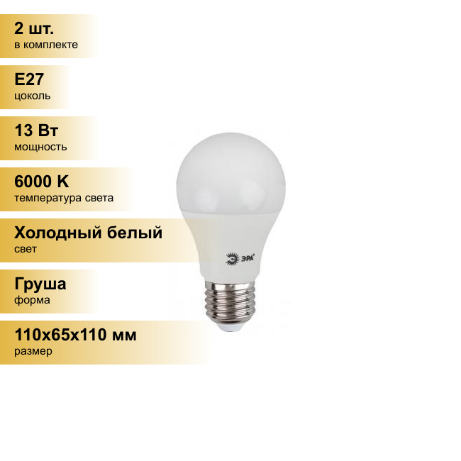 Купить (2 шт.) Светодиодная лампочка ЭРА стандарт ЛОН A60 E27 13W(1040lm) 6000K 6K 110x65 13W-860-E27 0287 Холодный белый. Цоколь E27