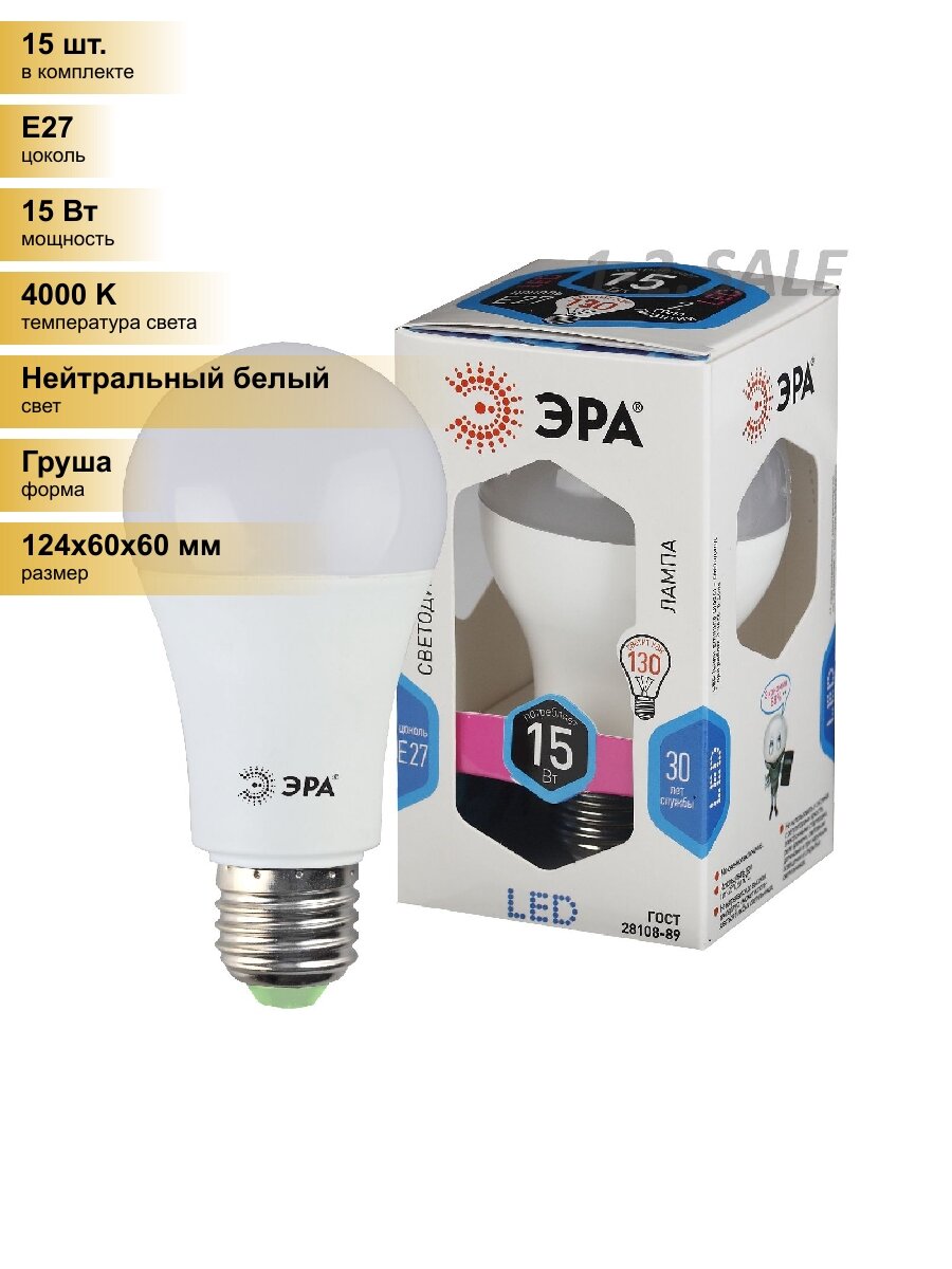 Купить (15 шт.) Светодиодная лампочка ЭРА стандарт ЛОН A60 E27 15W(1200lm) 4000K 4K 124x60 A60 E27 15W-840-E27 Нейтральный белый. Цоколь E27