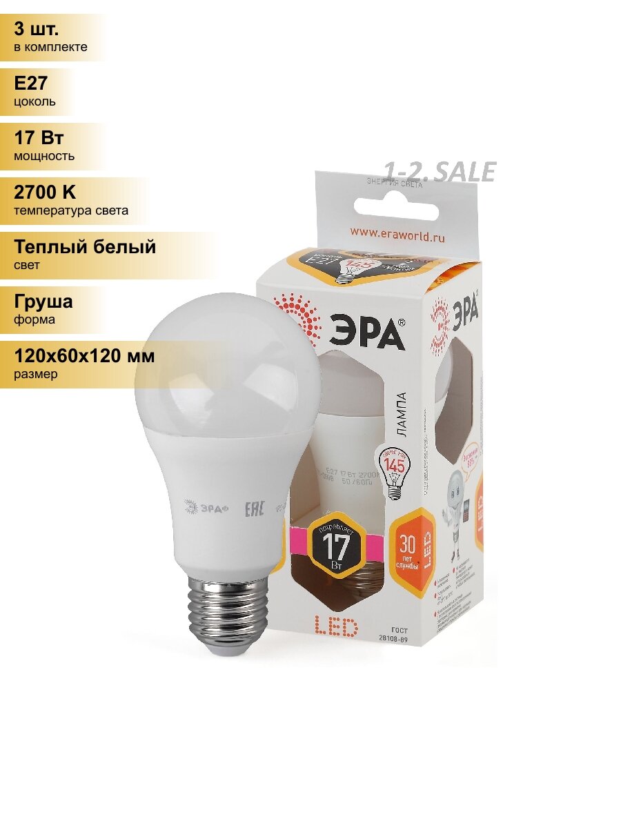 Купить (3 шт.) Светодиодная лампочка ЭРА стандарт ЛОН A60 E27 17W(1360lm) 2700K 2K 120x60 A60-17W-827-E27 1658 Теплый белый. Цоколь E27