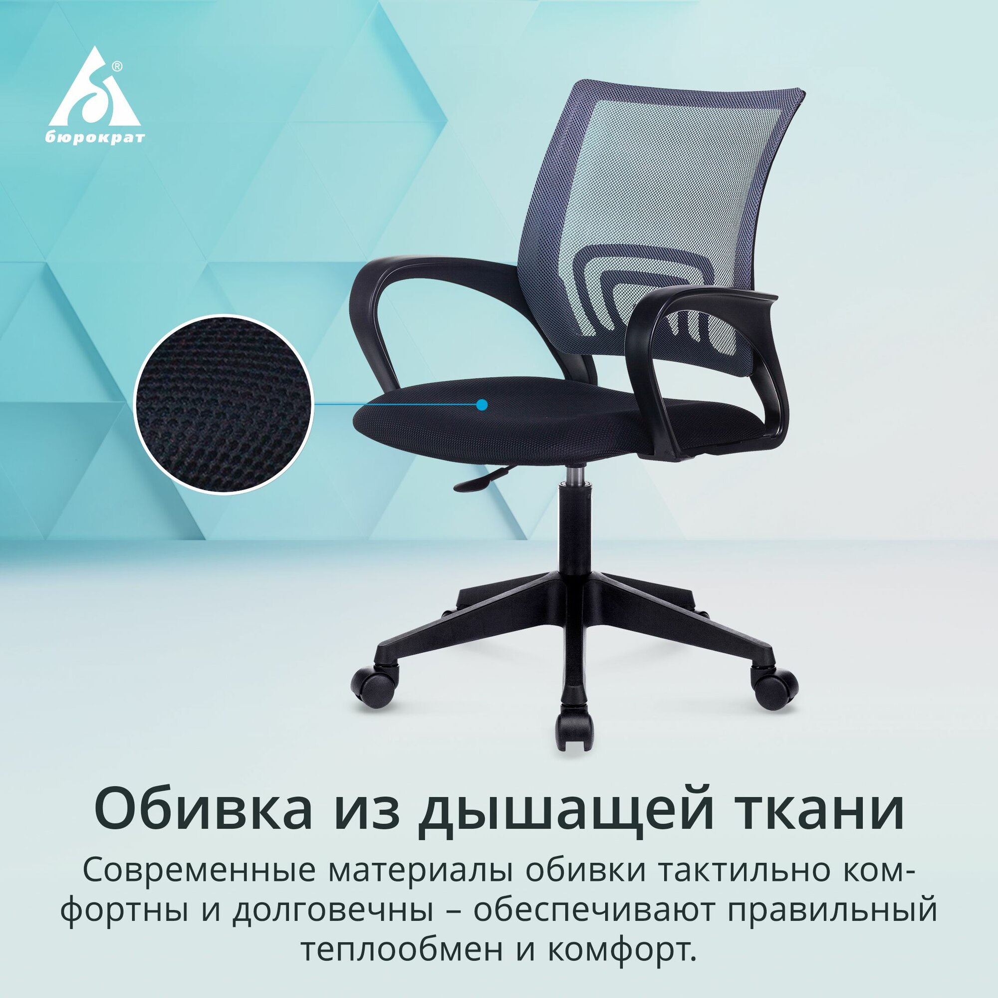 Спинка из сетчатой ткани - спина не потеет. Сидение из тканевой обивки, что тоже даёт положительные ощущения |