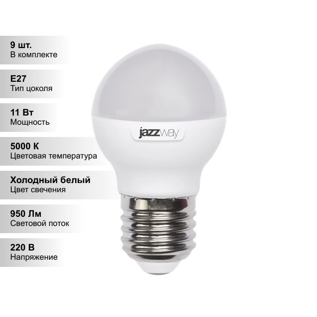 Светодиодная лампочка Jazzway G45 9Вт 230В 5000K E27 (10 шт.)