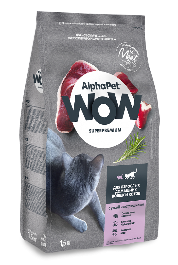 Купить AlphaPet WOW Superpremium сухой полнорационный корм для взрослых домашних кошек и котов с уткой и потрошками - 1,5 кг