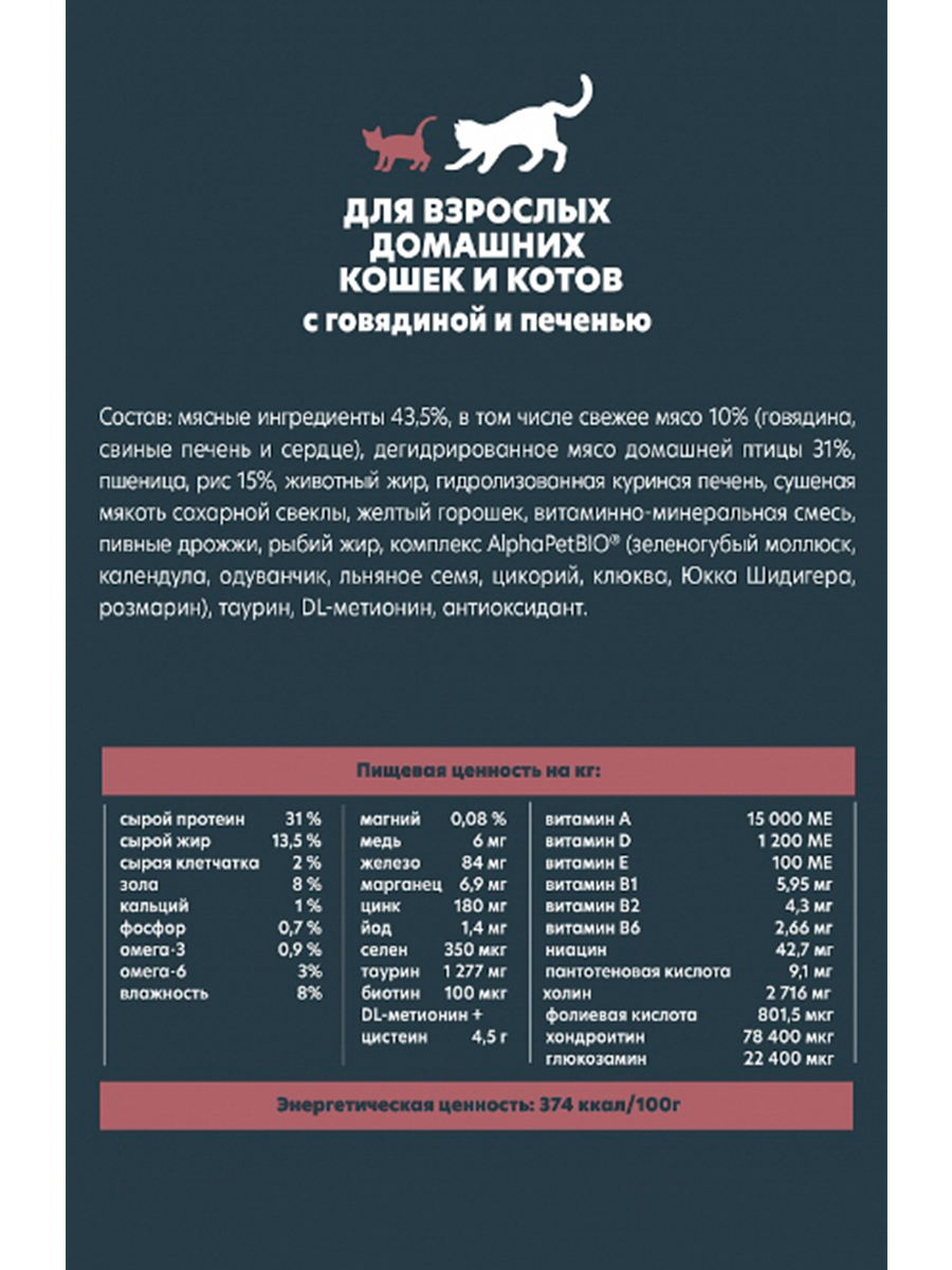 | Состав | мясные ингредиенты 43,5%, в том числе свежее мясо 10% (говядина, свиные печень и сердце), дегидрированное мясо домашней птицы 31%, пшеница, рис 15%, животный жир, гидролизованная куриная печень, сушеная мякоть сахарной свеклы, желтый горошек, витаминно-минеральная смесь, пивные дрожжи, рыбий жир, комплекс AlphaPetBIO® (зеленогубый моллюск, календула, одуванчик, льняное семя, цикорий, клюква, Юкка Шидигера, розмарин), таурин, DL-метионин, антиоксидант |
