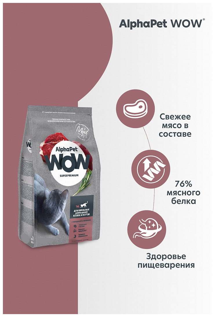 Корм сухой Alphapet WOW Superpremium с говядиной и печенью для взрослых домашних кошек и котов, 750 г