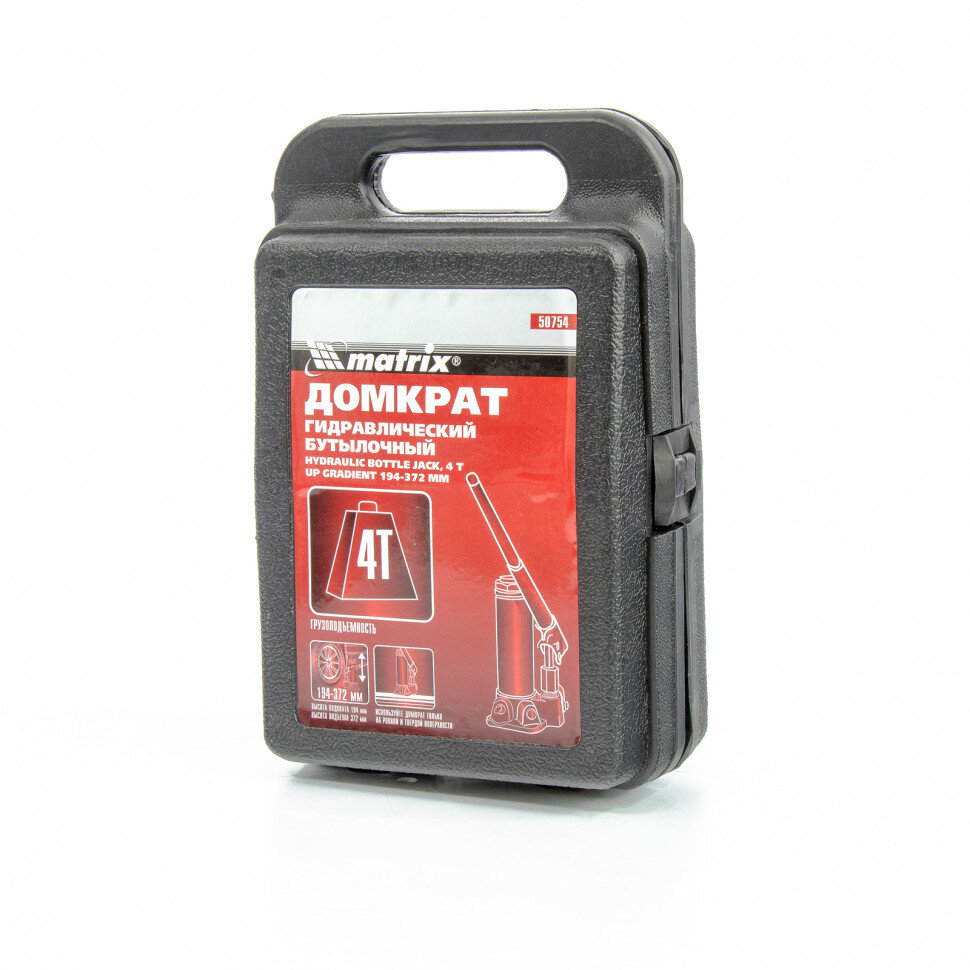 Купить Домкрат гидравлический бутылочный, 4 т, высота подъема 194-372 мм, в пластиковом кейсе Matrix 50754