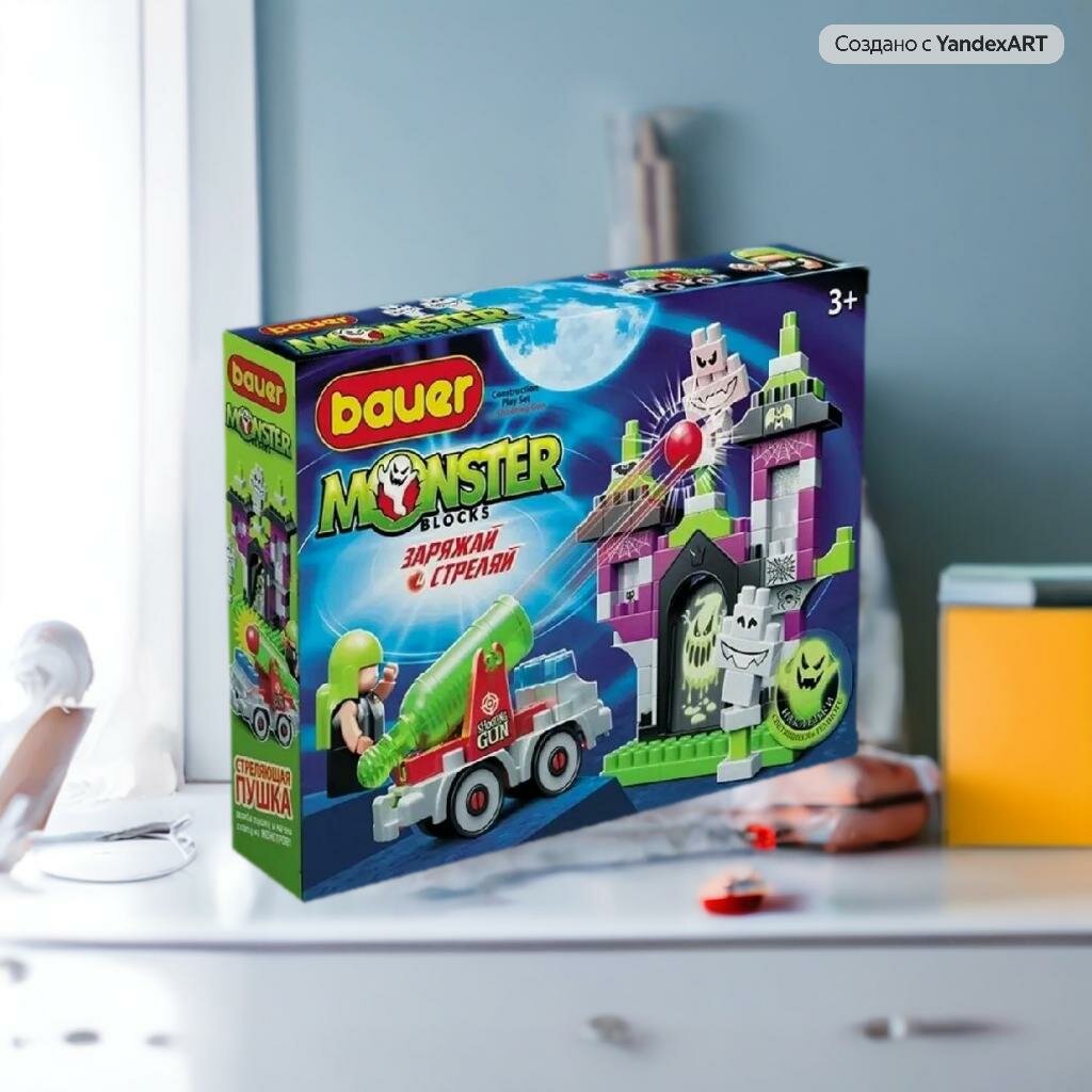 Детская развивающая игрушка конструктор Bauer Набор дом с привидениями, пушкой и охотником в коробке "Monster Blocks" 3+