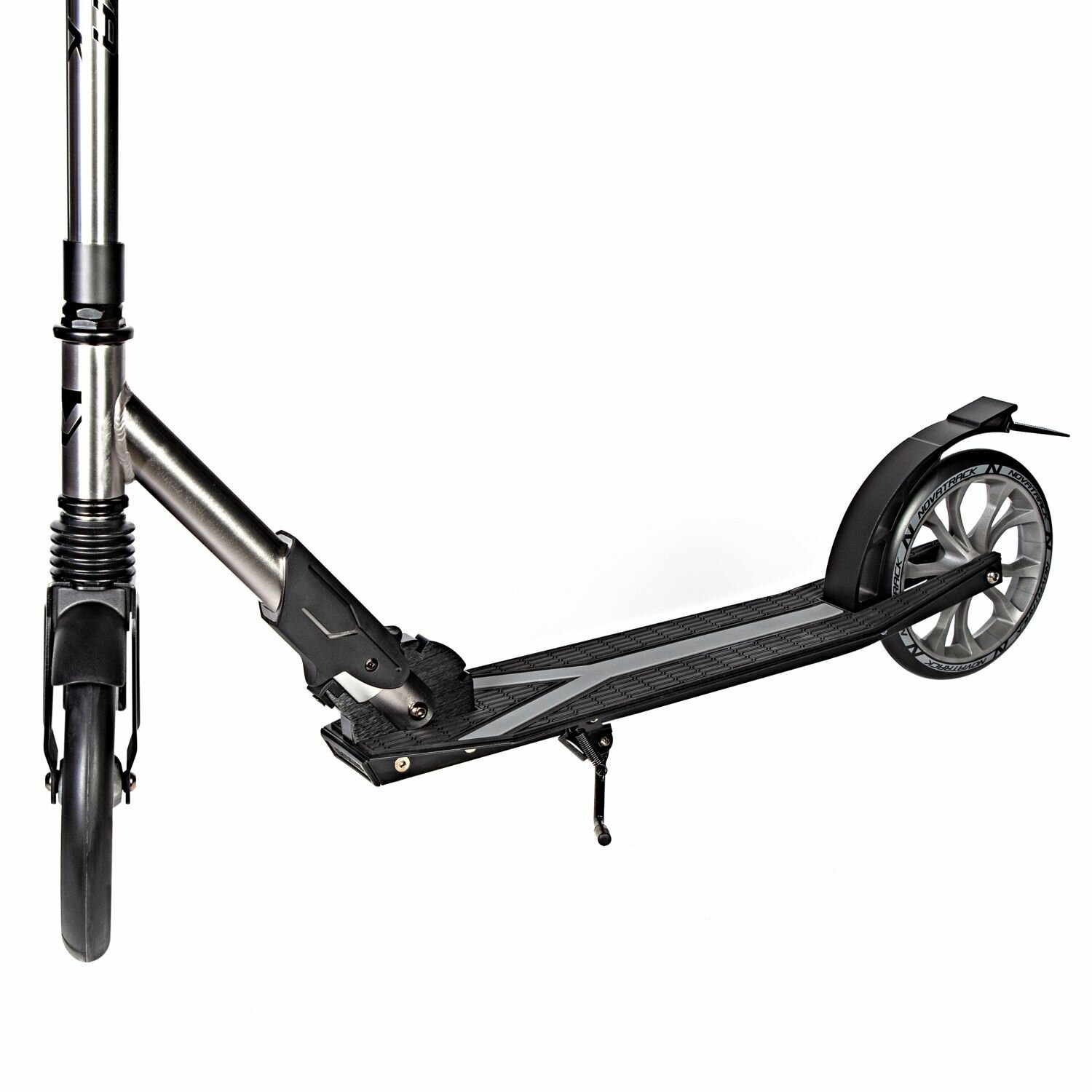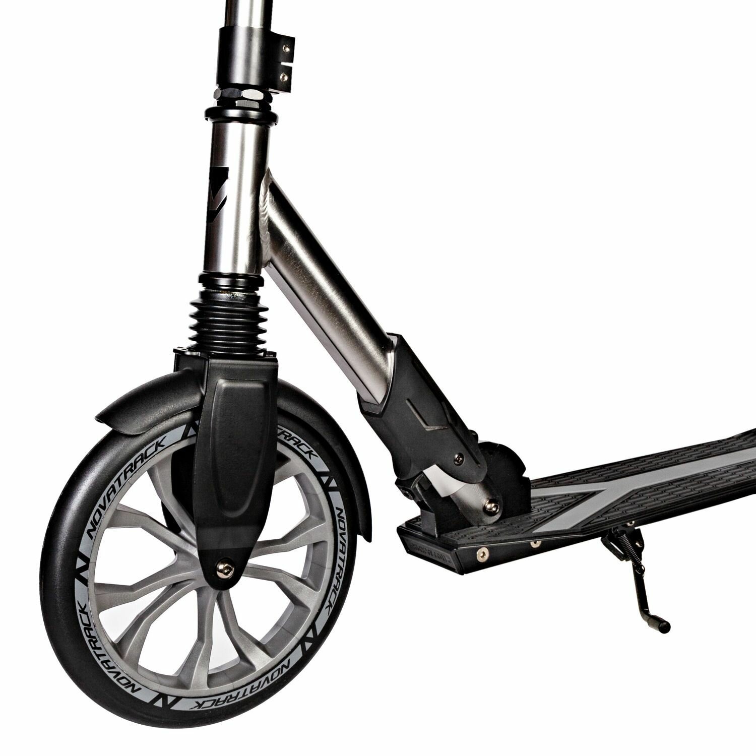 Купить Самокатдля детей NOVATRACK DEFT PRO алюм, амортизатор, колеса 230*200 мм PU, эргономичный Y-руль с фиксатором складных рукоятей, серебристый