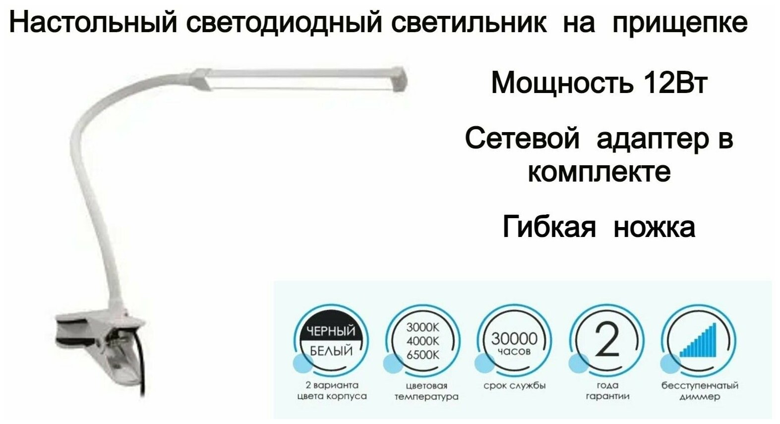 Светильник настольный светодиодный белый 12вт, светильник на прищепке для рабочего стола, настольная светодиодная лампа в офис.