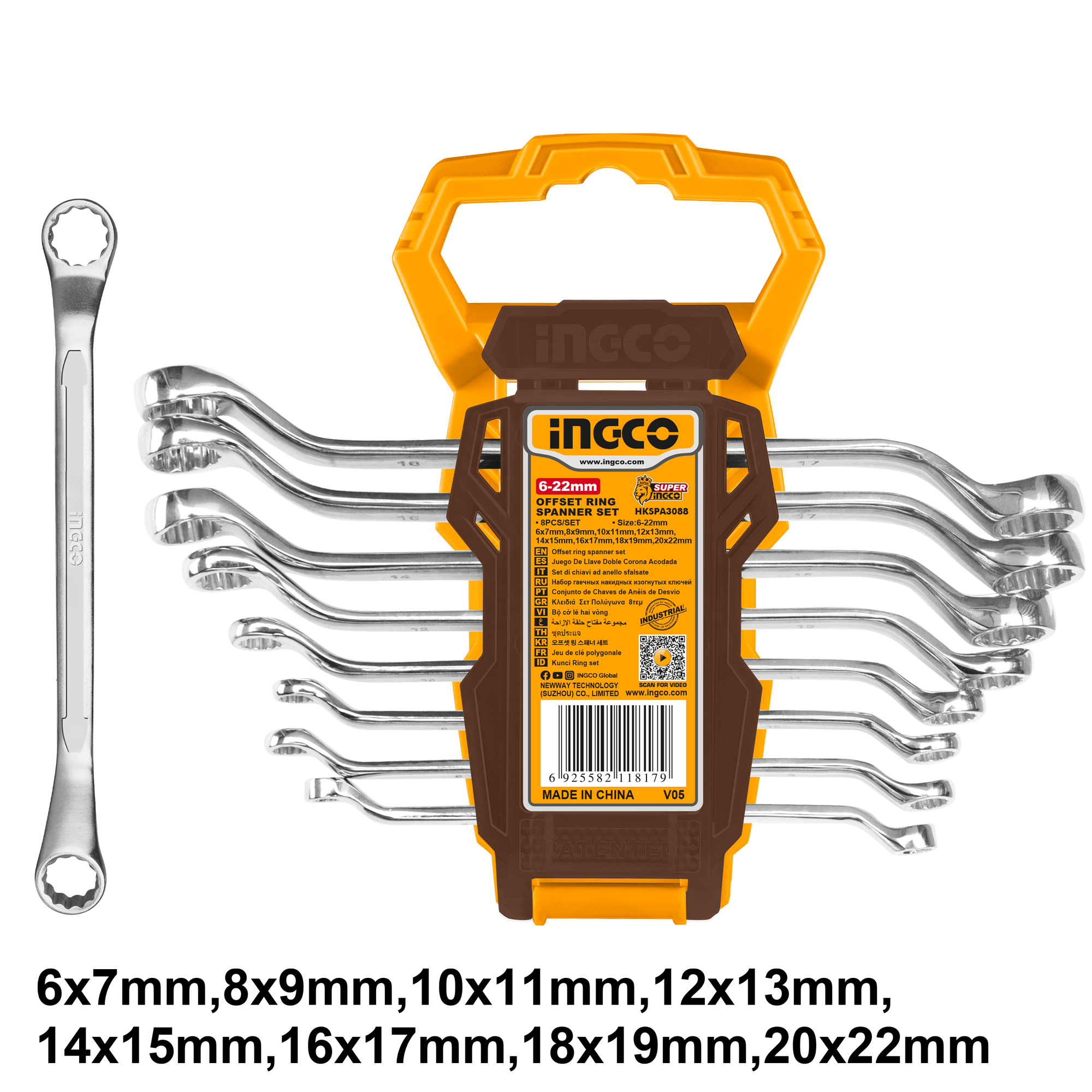 Набор накидных изогнутых ключей INGCO HKSPA3088 INDUSTRIAL 6-22 мм 8 шт.